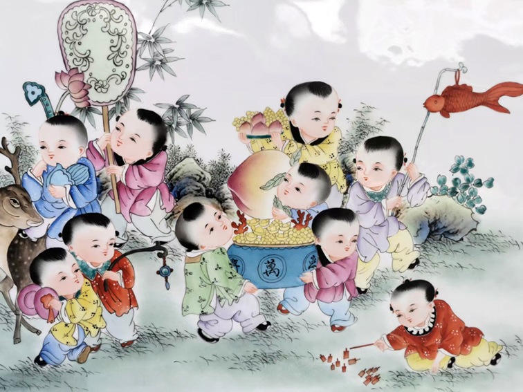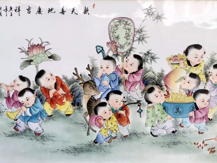 景德镇福全手绘欢天喜地瓷板画以童子为主画面,童子闹春,是传统题材,画上通常画着一群童子,他们姿态各异,或手捧寿桃,或游戏嬉闹,齐闹新春,十分喜庆可人。