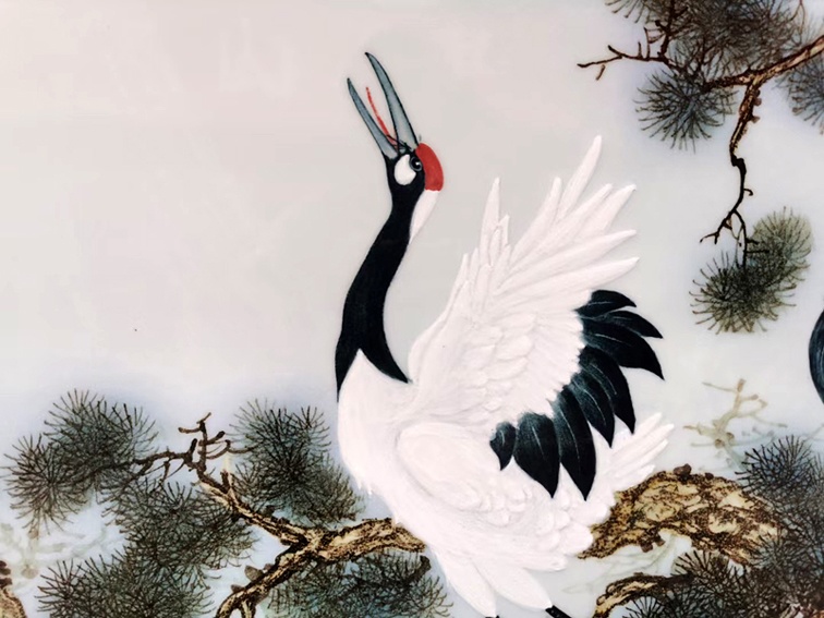 此幅《松鹤延年》图瓷板画,松针茂密而疏松,作为画面的中心,丹顶鹤俨然是这方小小世界的主宰,神态安详。整幅画作给人以一种福寿康宁的愉悦和满足,充分地体现了“松鹤延年”的题旨。画法以枯笔画轮廓,笔断意连,笔法清秀奇丽。